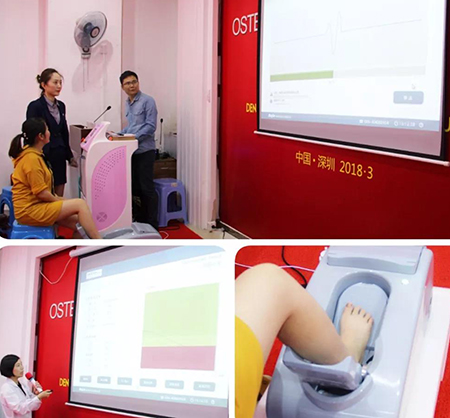 儀式上,主持人對儀器做了介紹,OSTEO KJ3000系列超聲骨密度儀,是南京科進與韓國骨密度儀制造商多年技術合作、結合我國國情研發的新一代跟骨超聲骨密度儀,通過對足跟的測試,即可在15-20秒內出結果,對成人骨質疏松診斷、治療骨質輸送藥物的療效檢測和評估有重要作用。