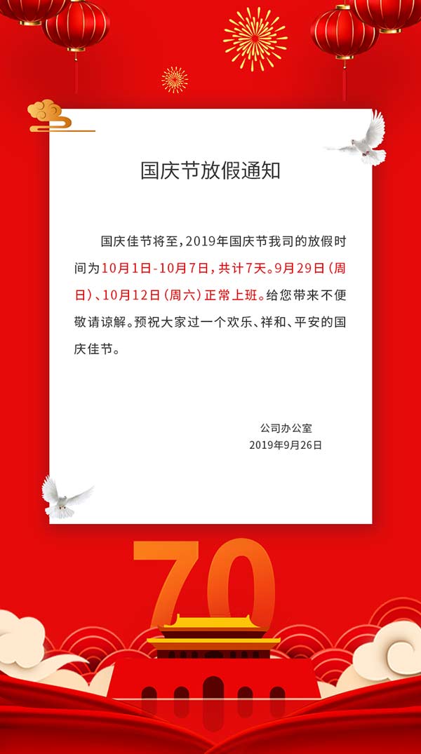 南京科進2019國慶節放假通知